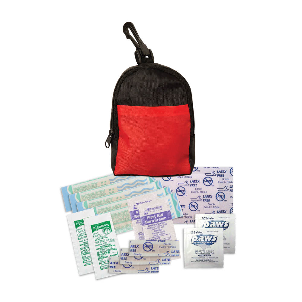 This 15 piece mini backpack first aid kit features a clip for easily attaching to backpacks, purses or laptop cases. Included in the backpack are 5 latex free bandages, 2 paws toweletts, 2 hand sanitizer packets, 2 first aid cream packets and a (2″x 3″) adhesive pad. 5″ H x 4 1/4″ W x 3/4″ D